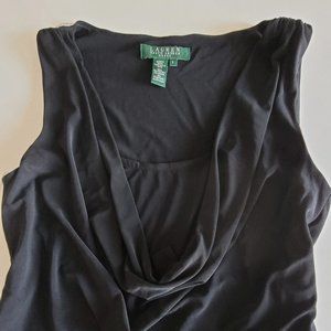Ralph Lauren midi black cowl neck sleeveless dress, the drape cowl neck has a breast panel (better coverage) for a classic look, one of the pictures show the hidden weighted tag that makes the cowl neck drape nicely; cinch waist with tie-belt of same material;