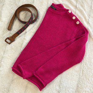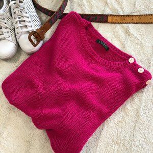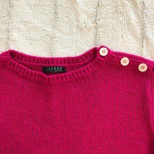 This is a phenomenal little sweater by LAUREN Ralph Lauren in a gorgeous hot pink colour. Left shoulder has 3 pearl coloured buttons in a row for a nice asymmetrical accent. Cropped style that sits just at the waist. Light and loose feeling 100% acrylic yarn, which hangs a little bit slinky and is super pretty layered over a plaid shirt. (But not super light... just not *heavy*... you know?) Pullover with a crew neck, and rolled edges at the bottom of the sleeves and body. A really stand out piece!