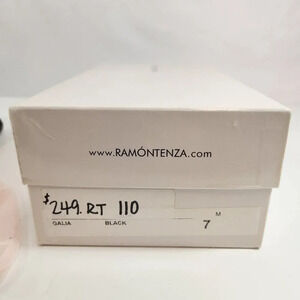Pair of pre-owned Ramon Tenza Womens Galia Black Open Toe Heels, size 7M. Shoes are in good condition with some wear and scuffing on the sole and markings on the toe of the shoe. They have a 3.5" striped heel. Please review photos closely for further details.