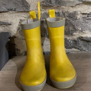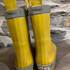 Jan and Jul's rain boots, size 6.5 US, are in used condition but have no leaks. Three of the four pull-on handles are broken (I would recommend cutting off the last one).