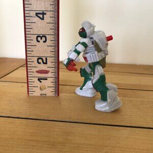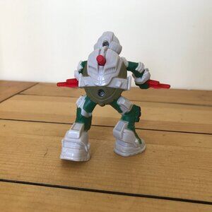 Teenage Mutant Ninja Turtles "Raphael" character collectible action figure from McDonald's, swings both arms when the red button on the back is pushed. Figure stands approx. 3 1/2" tall x 3 3/4" wide x 3". Pre-owned "played with" condition: small marks/scuffs to plastic. See photos.