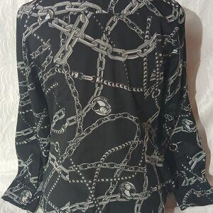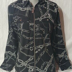 Rare Michael Kors zip up blouse chains black silver Cuban links emblem silver. Beautifully with zipper undone like cardigan or zip up, Realer cut classic sides. Zipper pull has MK tag style pull it’s a stunning piece to own. Size SMALL. In new condition - No flaws. 100% Polyester.