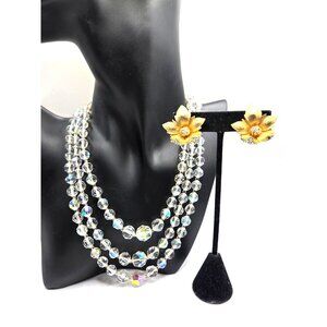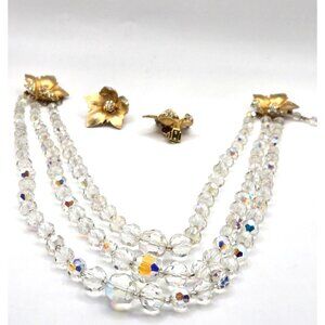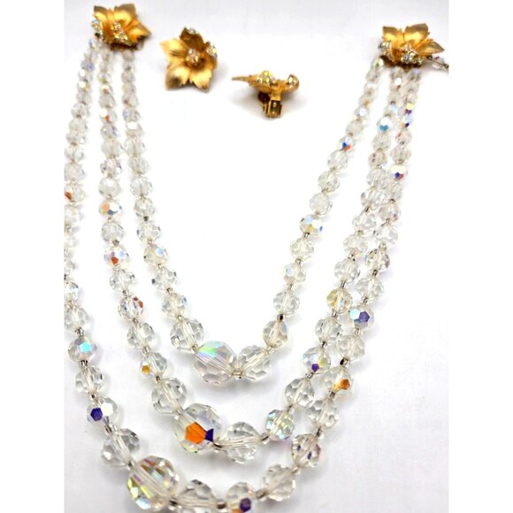 Rare unsigned exquisitely made and designed gorgeous demi parure set with gold plated floral earrings encrusted in diamantes at the rim and center with the same floral design at the clasp of the triple strand graduated crystal necklace. Earrings are 1" clip ons and the necklace is 18" and also has an extender. High quality and head turning.
