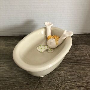 This elegant bath storage piece by Fitz and Floyd features a classic oval-shaped tub in an off white colour, inside the tub is a man with orange hair and a green tie and he is being sucked down the drain. The piece is called “down the drain”.