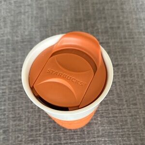 Vibrant orange travel mug with white accents. Features Starbucks logo on lid.