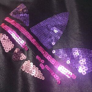 set from mid90s-early2000s black wet look with sequins in light and dark pink, and purple , Coat lined in purple satin Korn Jonathan Davis Style Blinged Out Pimped out suit
