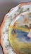 This is an antique (Circa 1915) Royal Doulton bowl (fruit bowl) "Bluebell Gatherers". It has a scene of woman carrying a basket with a child while standing amongst bluebells at their feet. There is yellow grass, trees without leaves and dark twigs along the scalloped rim of the bowl which is trimmed in black.