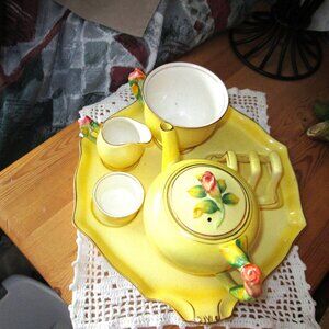 A rare antique/vintage beautiful valuable practical historical 7-piece Grimwades Royal Winton china breakfast set circa 1930's to 1950's made in England. These impeccable pieces of beautiful golden yellow china with delicate pink roses are breathtaking history to simply spoil yourself with a hot cup of tea from the 10 oz. teapot adorned with rose budded lid with the Grimwades stamped patent number on it & teapot with the beautiful rose budded handle and adorn your tea with a douce of cream from the tiny creamer that also has a tiny pink rose budded handle with a piece of toast from the 2 slice toast holder. There is a small sugar bowl for jam or sugar as well. The platter measures 10 inches (26 cm long) x 8 3/4" (22 cm) wide and 1 inch deep (2.5cm). All pieces are stamped on the bottom with the Grimwades stamp. This breakfast set is a special set for one person. Perfect to wake and have your hot beverage and newspaper, magazine, or book or that very special surprise to a darling daughter as a gift for wife or mother or that best friend as a special to start off the day either from your cool sheets feeling the breeze from your ocean window, patio or special spot. A beautiful surprise gift for any season. All items will be individually securely wrapped in bubble wrap, so as to arrive to a pleased recipient. Every Grimwades china piece is in impeccable condition. A jewel of a china breakfast set for your prized one and only princess or prince.