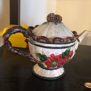 Original Appletree Designs Teapot - Whimsical Design with Pine Cones and Poinsettias. Poinsettia Design is a Rare Find.