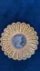 "Celebrity NY" brooch featuring a cameo set in a gold-tone filigree flower. The brooch has a round, gray cameo at the center, depicting a woman's profile, surrounded by an intricate, open-work gold-tone filigree design resembling petals.