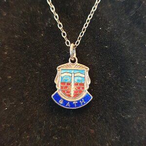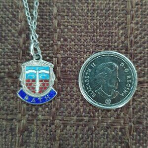 It is a vintage silver shield-shaped charm with enamel on the front - BATH, with the Bath UK Coat of arms on it. The charm and necklace are fully hallmarked and in great condition.