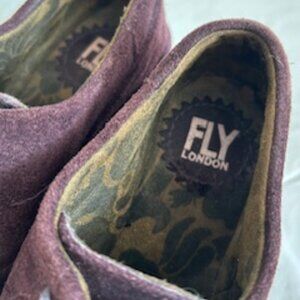 Rare Fly London suede lace up wedges in eggplant purple, animal print interior, heel colour is taupe-grey, size 35.