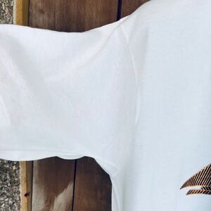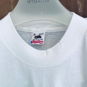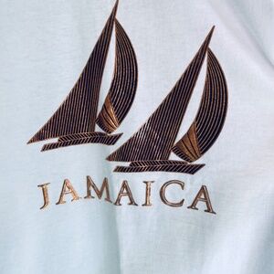 A superbly preserved white pure cotton T-shirt from the eighties with no side seams and a single seam on the bottom and sleeves, with the original gold sailboat design and the word Jamaica!