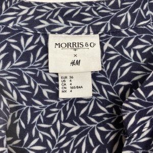 H&M x Morris & Co - Tunic / Blouse - Floral / Willow Wood Leaf Print - William Morris / Liberty Print - Navy & White - Buttonned Cuffs - V Neck - 100% Viscose - Very soft - Excellent preloved condition - See pictures for details - Size 4 - Fits large - Sold out - Rare