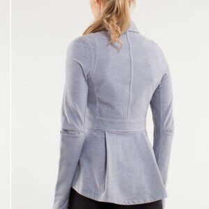 This is one of the most unique jackets! It has some moto details in the front but longer in the back with pleats at the seam. There is a cropped inner jacket that you can unzip and detach. There is a very beautiful almost lace looking trim at the elbows, and collar that give it a feminine vibe. It's a heathered blue grey colour. Some signs of wear and a small amount of piling, but not very noticeable because of the heathered aesthetic. Wish this fit me because its stunning!