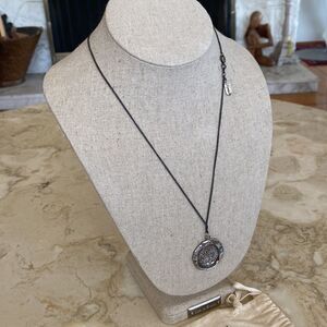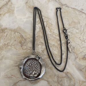 In excellent preowned condition rare archived Pyrrha sterling silver talisman hanging from a 20” Pyrrha blackened sterling silver curb chain.