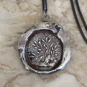 This beautiful and heavy talisman reads 'Fidele En Absence' in French, meaning 'Faithful in Absence'. A turtle dove perches on the tree of life, symbolising interconnectedness and unity.