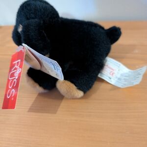 Hard to find. Rare Handmade vintage plush dog by Russ Berrie and Co., featuring soft black and tan faux fur and a red heart accent. This charming collectible showcases classic handmade construction with original tags attached, reflecting the quality Russ Berrie is known for.