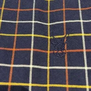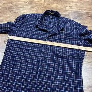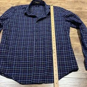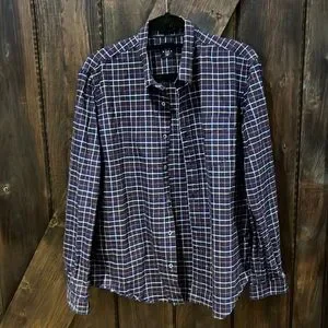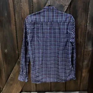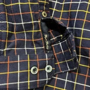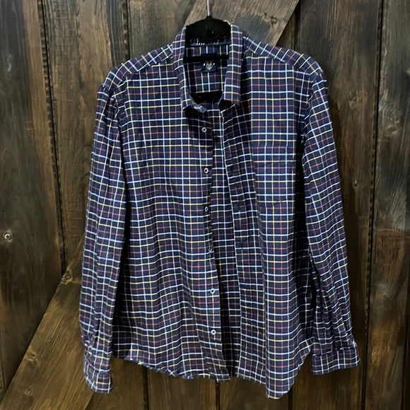 Rare Rabbit long sleeve plaid button down top. Navy blue mixed with orange/yellow/white plaid patterning. Spare buttons on laundering tag. Size L. Excellent gently used condition.