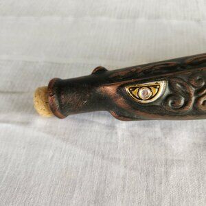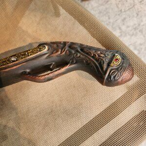 Unique and rare Russian vintage brandy decanter, 14 inches long, beautifully designed in the shape of an ornate pistol. Detailed with scrollwork, gold-tone accents, and jewel-like inlays, this piece is both decorative and functional, with its original cork stopper intact.