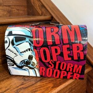 Box: 11" x 8.5" x 4 3/8". Features wrap around design of Star Wars stormtrooper Character.