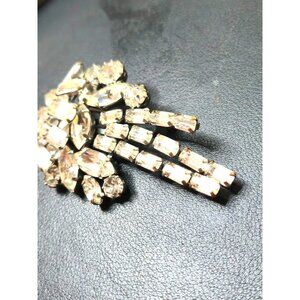 Rare and exquisite vintage rhinestone brooch, circa 1950s, most likely an early unsigned Sherman. Features brilliant marquise, round, and baguette-cut clear crystals arranged in a dramatic cascading waterfall design. Exceptional hand-set construction with triple structural rails visible on the reverse—an engineering hallmark of authentic Sherman workmanship. Hand-finished rhodium plating remains bright with light age patina. Measures approximately 3" long by 2" wide. Rollover clasp is secure. All stones are original, bright, and well matched. A rare and glamorous mid-century collector’s piece showcasing the precision and elegance for which Sherman jewelry is celebrated.