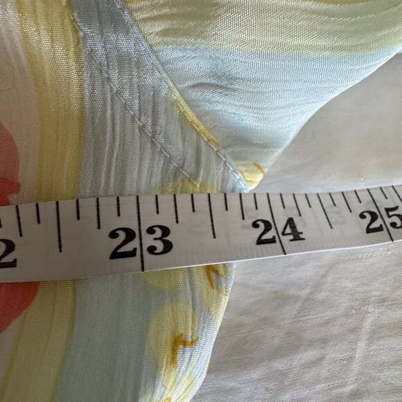 Vintage early 90s Victoria's Secret Terry Lined Robe With Pink Rose Floral on Blue and Yellow Brocade Print. Inner tie, two pockets, sash is not the original one that came with it and is a wide satin replacement I used. No size tag, fits like a M. Has some faint yellowing on terry collar as shown in photo 6, the terry fabric is worn in some places and there is a spot where it is missing on the left cuff in photo 9, photo 10 shows small stains on inner right arm of robe. Bust measures 24 inches laying flat, hips measure 23.5 inches flat, length from shoulder to hem is about 48.5 inches. Cat friendly, nonsmoking home.