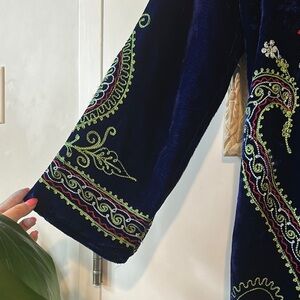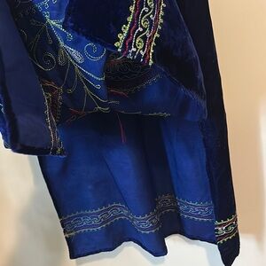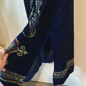 Rare Vintage 1970’s India Crushed Velvet Rayon Embroidered Blue Kaftan Maxi