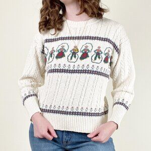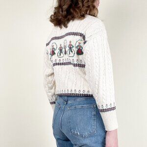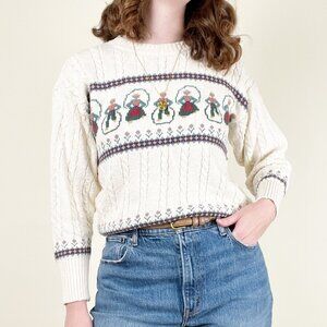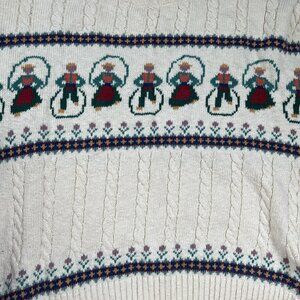 Features: Long sleeves, crew neck, cable knit pattern, fairisle stripes, kids playing jump rope & flowers