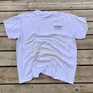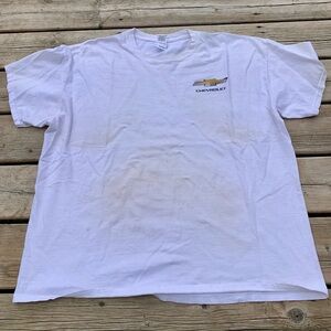 Show off your love for Chevy in this bold white Gildan t-shirt featuring a striking green Camaro graphic on the back and the classic Chevrolet logo on the front. Size XL, made with heavy cotton for durable comfort. Some light stains present (see photos), but still a great vintage-style tee for fans or collectors.