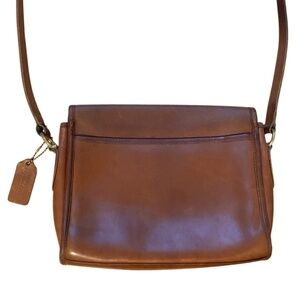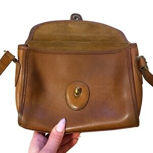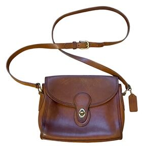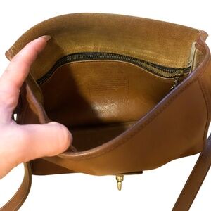 Great classic leather crossbody. Fold over flap with turn key lock closure. There is a slip pocket on the back exterior. Inside is unlined with a zipper wall pocket. Long adjustable strap with brass buckle. Includes original Coach hangtag.