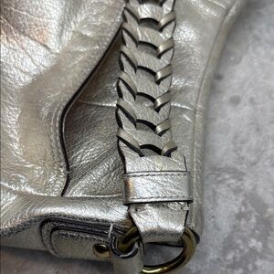Stand out piece. Elegant silver leather bag with a stylish braided handle. Perfect for any occasion. Excellent condition. See photos for a few small marks in the lining but otherwise amazing condition!