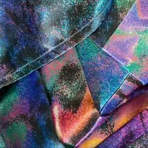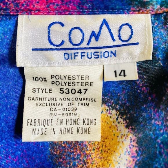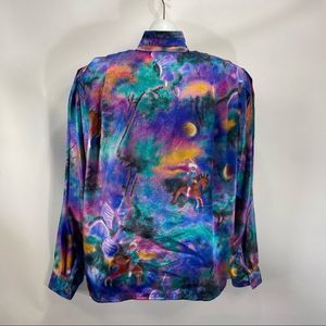 This unique, rare Vintage Como Diffusion blouse is in excellent pre-owned condition. Tri buttoned collar, ultra soft like satin, Size 14, could fit 8-14 oversized style. Features an Arabian Nights horse rider scene. Padded shoulders, great structure. Definitely a conversation starter piece!!!