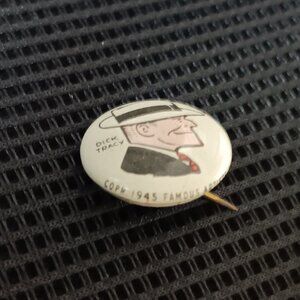 Rare 1945 Dick Tracy Pep Pinback from Kellogg's Cereal. Tin, Lithographed. In remarkable condition, particularly for it's age. Minimal scratches and the pin is shiny. The image itself has no wear. It measures 2 cm in diameter. Around the outer edge it says "COPR. 1945 FAMOUS ARTISTS SYN." On the interior edge, "MADE IN U.S.A." This pin was a promotional giveaway in the Kellogg's Cereal "Pep".