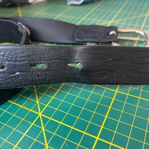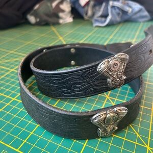 Super crazy vintage Harley Davidson belt with silver HD engine studs all the way through with the leather embossed with flame details