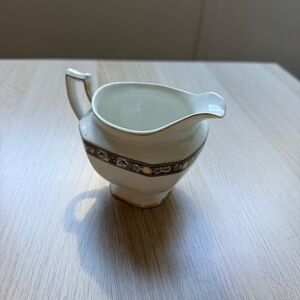 The creamer made by J & G Meakin in England, approximately 1912. The pattern is called Hanley and is described as white and red flowers with a black and tan outline on a white background. This band is around the largest part of the creamer body and there are gold accents around the mouth, foot and handle.