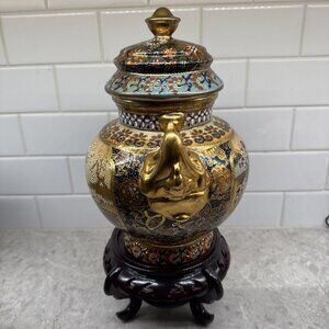 Elevate your collection with this rare vintage Satsuma piece, a true gem for enthusiasts of Japanese culture and craftsmanship. This exquisite item comes complete with a lid and stand, showcasing the meticulous attention to detail that is synonymous with authentic Asian collectibles.