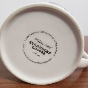 This is a rare festive ceramic mug from Starbucks, featuring a stars and snowflake design in holiday red and Starbucks greens. The mug has a capacity of 17 oz and is part of the Starbucks Holiday Collection from 2006, which was inspired by the iconic Starbucks Peppermint Mocha 12. The mug has a white exterior and a purple interior, with a touch of magic. This mug is a great gift for anyone who loves Starbucks, coffee, or winter.