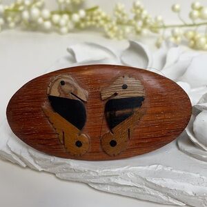 Rare Vintage Wooden Hair Barrette Oval Wooden Disk With Two Sea Horses