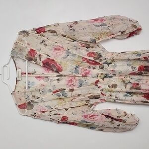 Super Rare! From the Winter 16, Ready-to-Wear collection, Master and Mischief! Airy, floral silk gives this Zimmermann dress a feminine aesthetic. Embroidered insets accent the bodice, shoulders, and hem. Buttoned half-placket. Detachable self-belt. Long blouson sleeves and asymmetrical hem. This dress comes with the matching belt. The white slip that originally came with the dress is not included. Please note that the dress has a large yellowish stain at the back, it mostly blends into the print but must be mentioned, (refer to 7th last photo). There are also bunch of runs and holes at the back of the dress, see last 6 photos. I have not attempted to de-stain or repair the holes. Price has been reduced to reflect this.