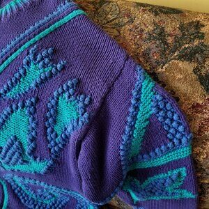Rare, vintage 80s, unusual, 3-D, very warm, heavy, thick cotton, hand knit, tunic sweater, leaves, raised stitches, ridges and bobble stitches. I have not seen another sweater like this. Mainly purple with medium blue and green forming large, three dimensional flowers, stylized leaves and geometric patterns, heavy weight, long sweater, hand made, artisan crafted, tunic length, mini dress length. Great condition for it's age, little wear, slight snagging of part of some knitted stitches, some stitches are slightly enlarged, shown in photos. Originally had thin shoulder pads that have been removed.