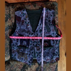 Rare, vintage 80s, Indian, floral, leaf, flowers and leaves, animal and mystic symbol embroidery vest, hand made, hand crafted, unisex. Medium to darker blue cotton with black cotton backing and back. Vest showing embroidered elephants, peacocks, tigers, gazelle (chinkara), horse, flowers and leaves, swastikas (5,000-year old symbols meaning sun, prosperity, good luck) left and right facing = balance. The highly embroidered material was old, vintage, when made into the vest, probably 60+ years old now. Slight mark on front v neck was there when originally purchased, shown in photo. Hardly worn, good condition based on age.