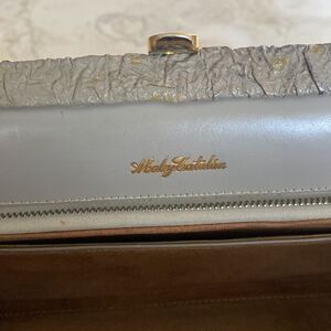 Very minor wear of edging, nothing noticeable, overall this bag is in very nice shape, closure works great, gold tone hardware, interior is leather lined and super clean with a zippered pocket and two slip pockets, plus the original little mirror that used to come with ladies’ handbags.