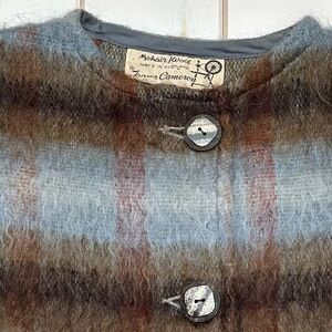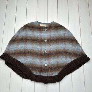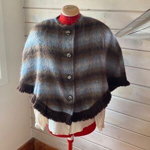 Stunning Vintage “Fraser Cameron” dusty powder blue and browns mohair/ Wool Capelet Button Shawl Made In Scotland. I believe it was made in the 60s according to my research on Fraser Cameron. Button up front. Brown fringe on edges. 40% mohair/55% wool/5% nylon. In excellent vintage condition.