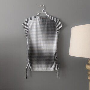 Zip neck and shirred sides allow for flattering fitted shape and cooling options.