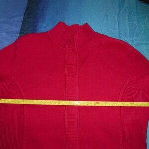 Raspberry Red Snap Cartigan size US small This item has no tags but is in excellent condition. It seems to be made of 100% cotton, From armpit to armpit it measures18 inches with considerable stretch. and from neck to bottom is also 18 inches. The snaps are very cute and satin covered, overall a very well made garment to elevate your look. The cotton fabric is quite thick.