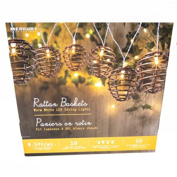 Rattan Basket LED String Lights / Battery Powered Warm White / 8.5ft Length NIB