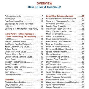 Raw-food diets have become increasingly popular and more and more people are looking to incorporate raw foods into their diets. The problem is that many raw food recipes require significant planning and preparation (using a dehydrator or a sprouting technique, etc.). That's where these delicious and tantalizing recipes are different -- all can be prepared and on the table in 15 minutes or less!