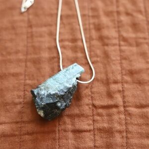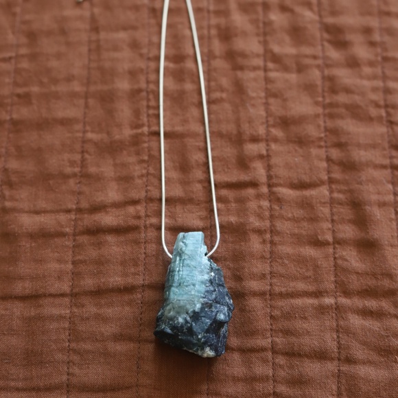 Raw emerald and mica semi precious stone/rock on long silver chain. NWT