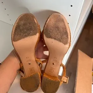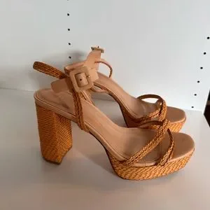 RAYE heeled sandals, 4 inches heel with 1 inch platform. Tan leather with braided texture.